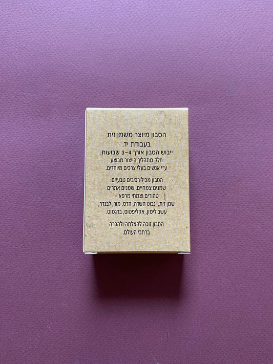 סבון מוצק טבעי, מיוצר בעבודת יד בצורה מסורתית על פי המתכון של הרמב"ם, סבון טיפולי שמבוסס על תמציות צמחים ושמנים טבעיים בעלי סגולות רפואיות מוכרות