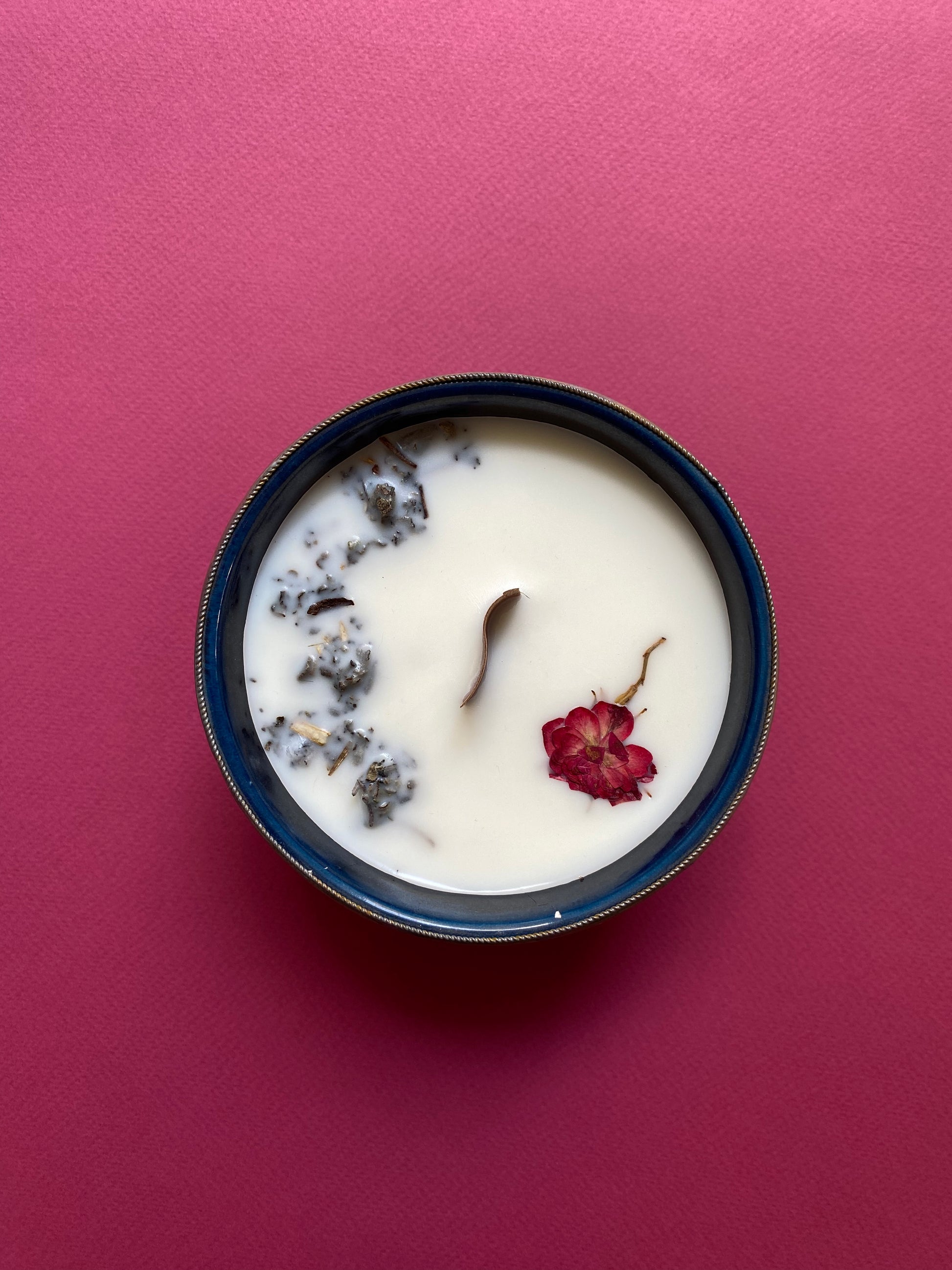 שעוות סויה טהורה , מרווה לבנה, פרחים מיובשים, פתיל עץ טבעי